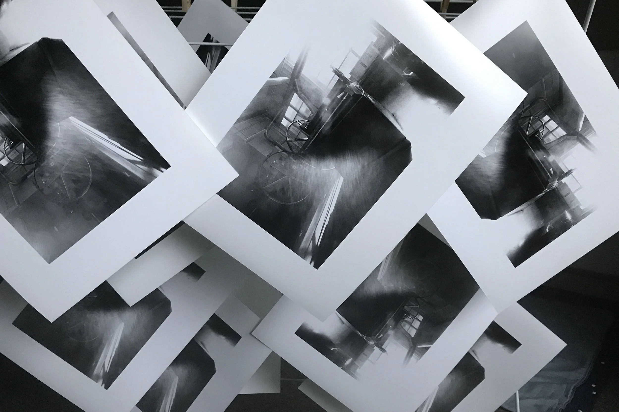 Zo Damage 2021, “Studio at dusk”, gelatin silver print, 14x11”, limited edition of 10. Drying editions