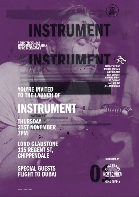 Young Henrys and Monster Children present InstrumentMagazine. This, the first volume of the publication, brings together eight Australian live music photographers – Charlie Hardy, Dougal Gorman, Ian Laidlaw, Joel McDonald, Maclay Heriot, Ruby Boland, Sam Brumby and Zo Damage – and a selection of their favourite homegrown live music moments through the lens. Copies of Instrument Magazine available for purchase on the night