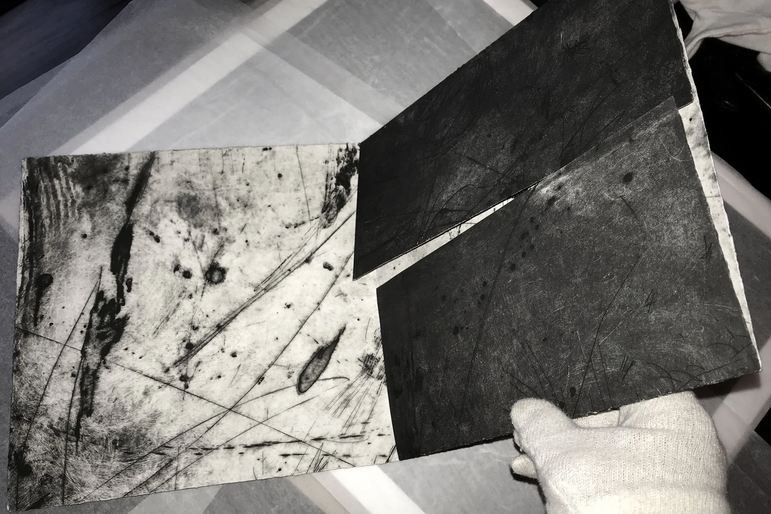 Figure 5: NoteWorthy gatefold monoprint (3 of 8), inside reveal (stage 1), Zo Damage 2022-2023