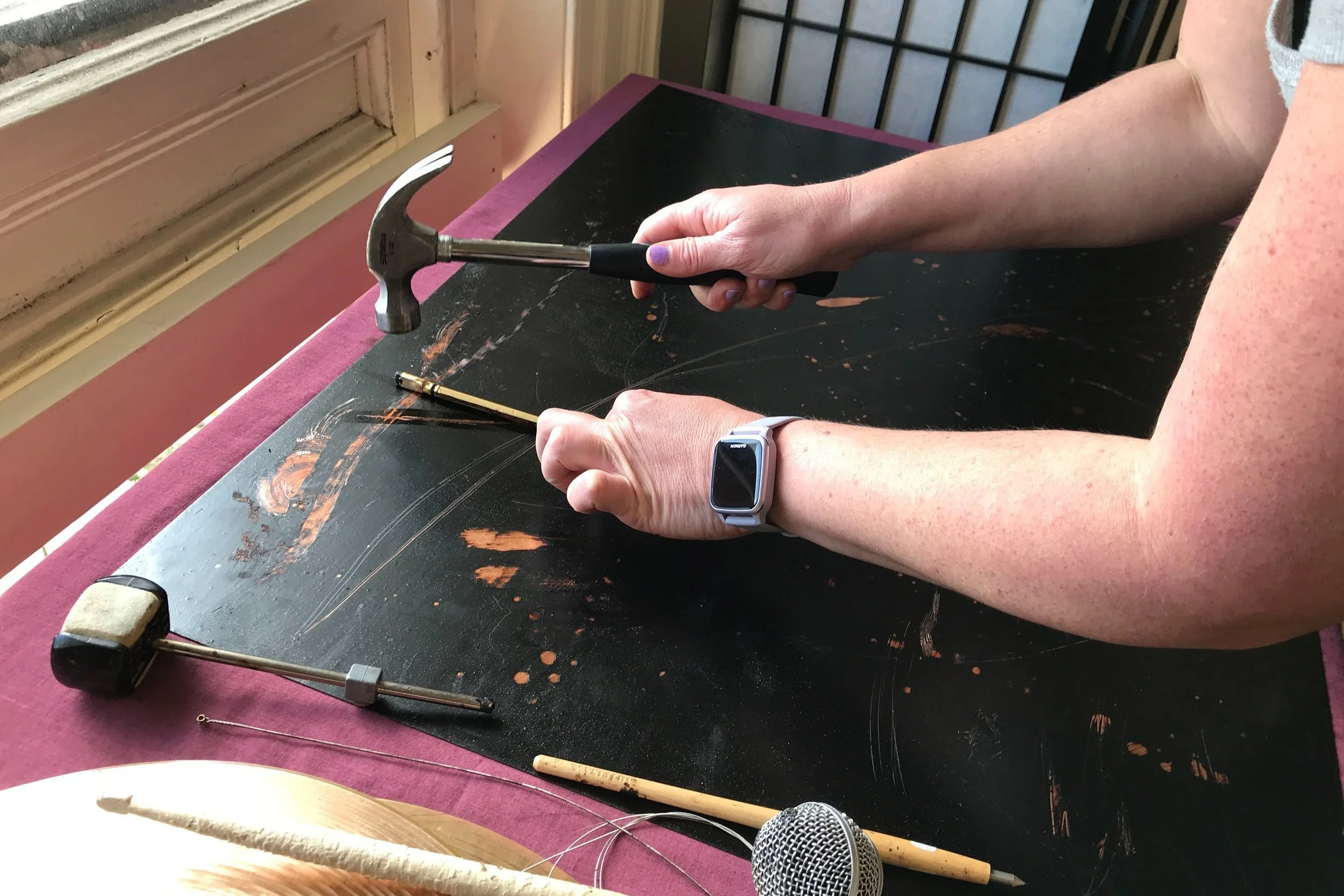 Figure 3: Katie Scott (Howl At The Moon) makes marks on the copper plates using broken instrument parts as etching tools. Katie also brought a pencil to use as an etching tool, the markings from which represent where her songwriting begins