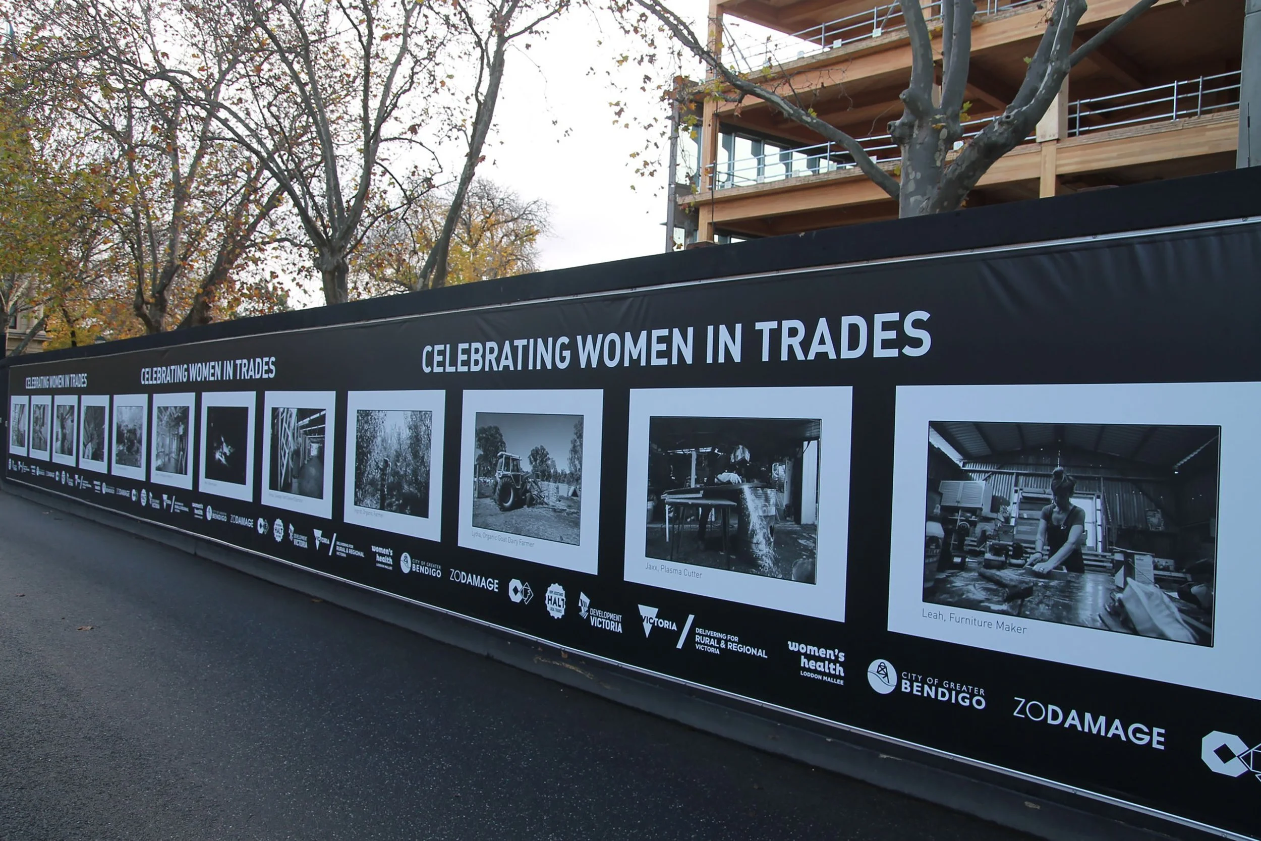 Women in trades, Zo Damage 2022, Bendigo GovHub Hoardings 2022. Installation view courtesy Women’s Health Loddon Mallee